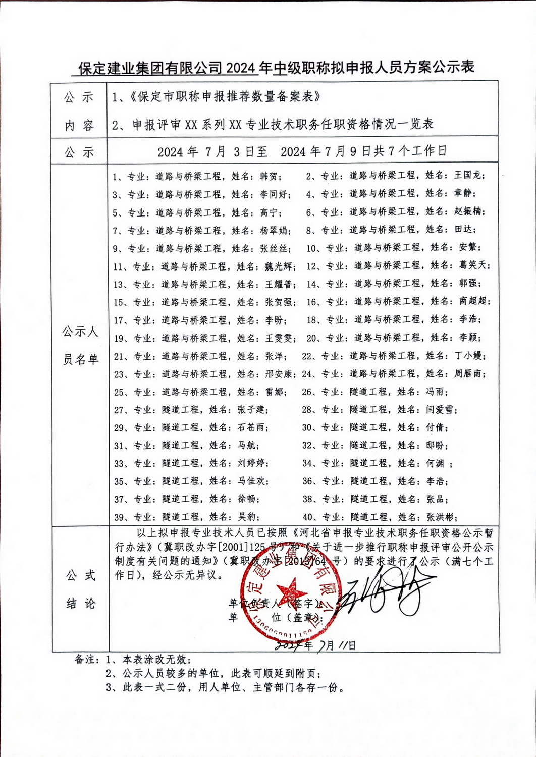 2024年中级职称拟申报人员方案公示-道路系列